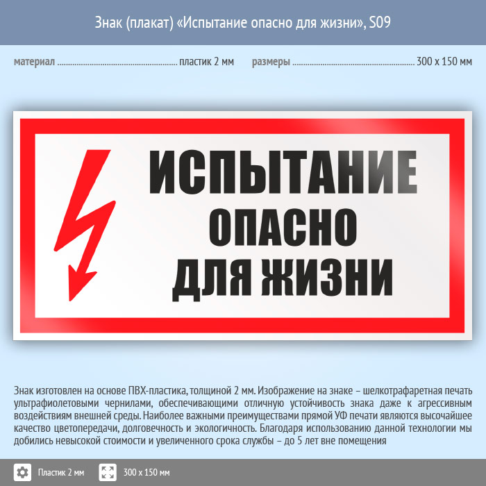 Знак (плакат) «Испытание опасно для жизни», S09 (пластик, 300х150 мм) в Майкопе купить
